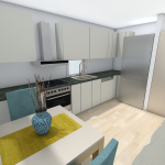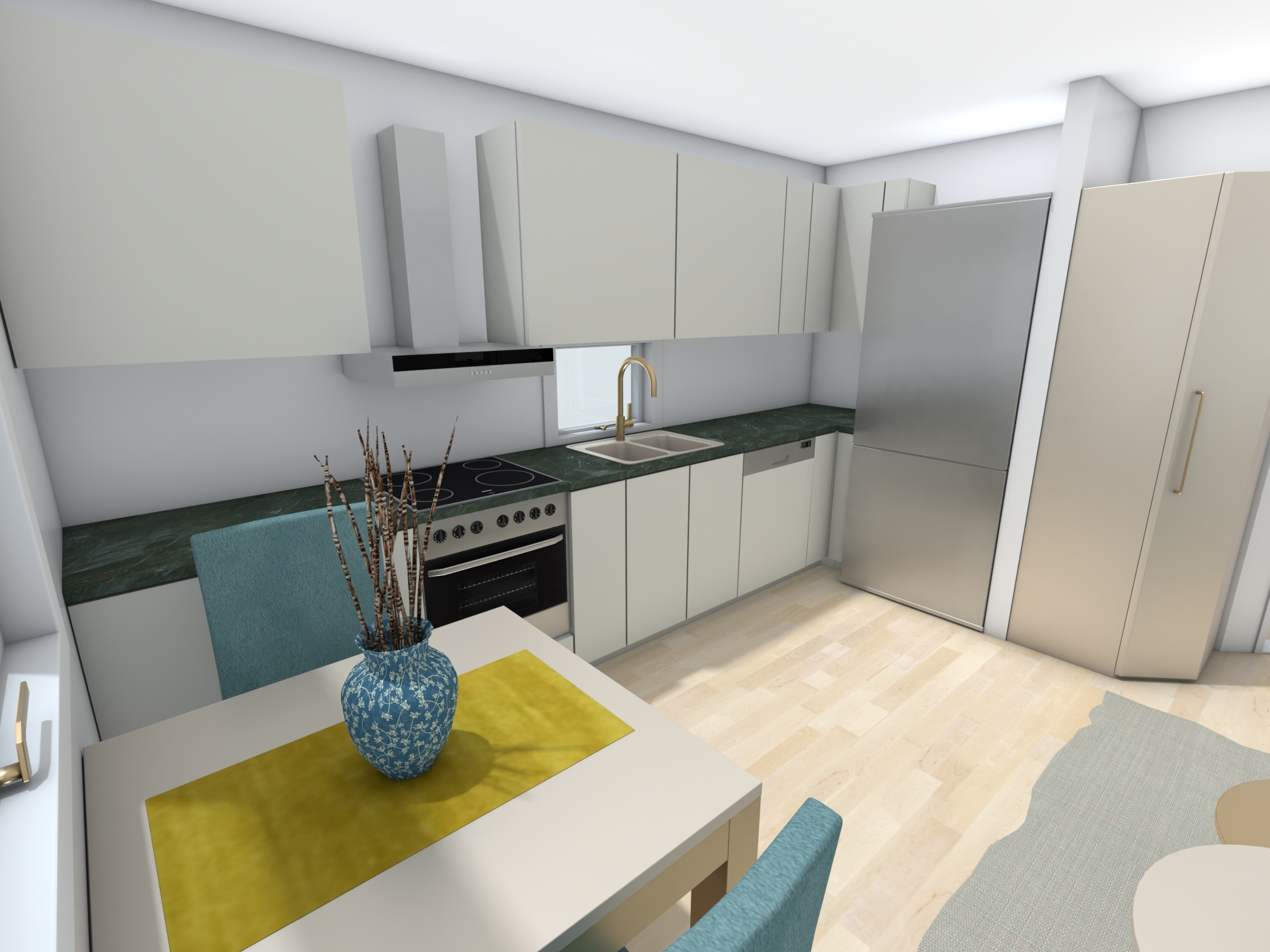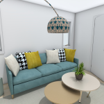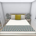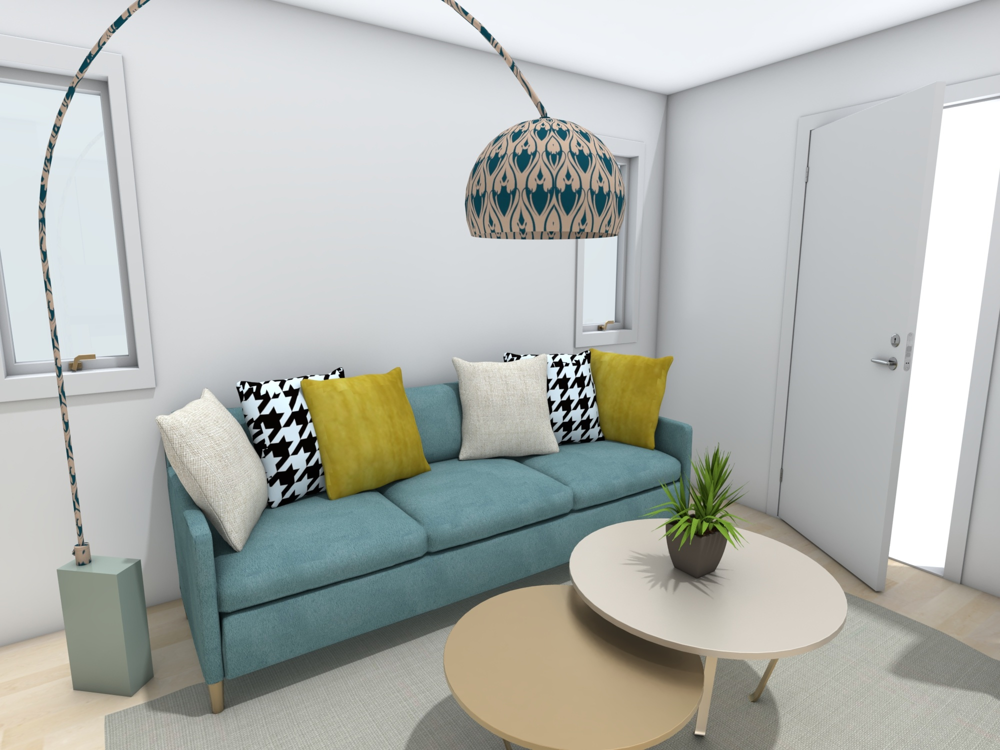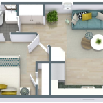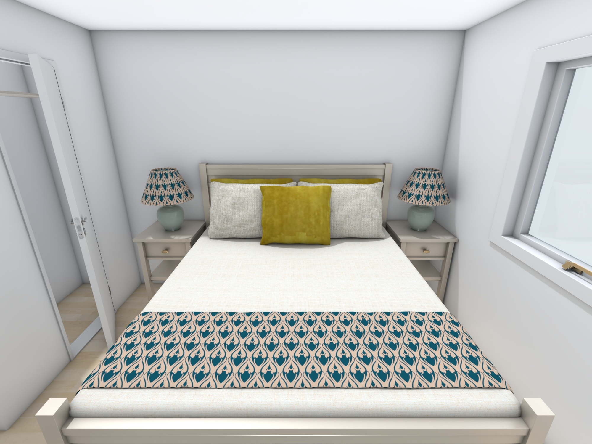 Multiple built-in closets and storage spaces are the highlights of this simple tiny house layout. You’ll enter an open-plan living, dining, and kitchen area. The L-shaped kitchen features a range, sink, large refrigerator, and plenty of counter space. The upper kitchen wall cabinets and sizeable built-in pantry unit are a dream come true for storage lovers.